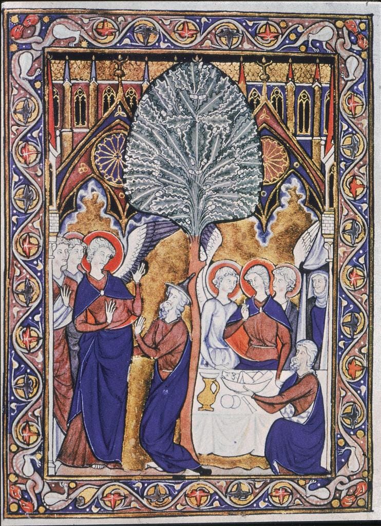 Here is a much earlier representation of the Hospitality of Abraham. It is a 5th-century mosaic from St Mary Maggiore in Rome: